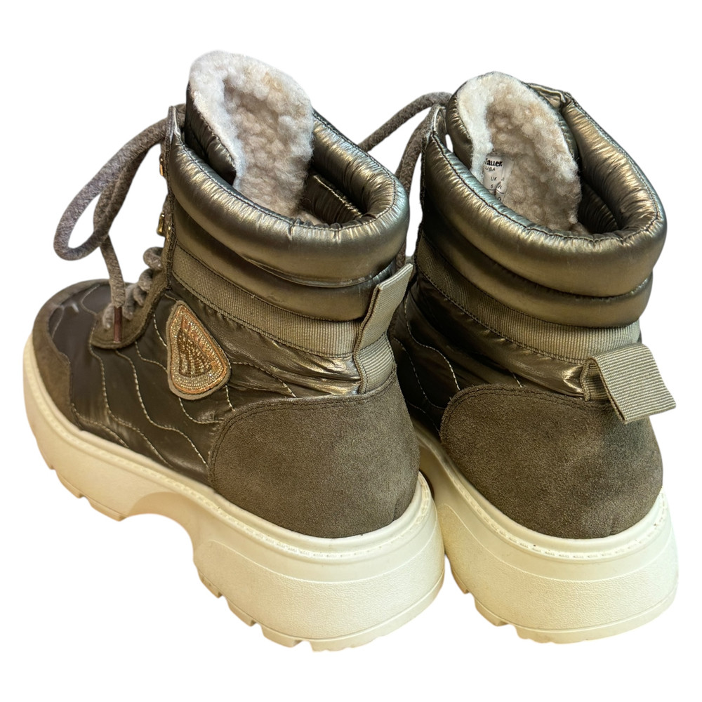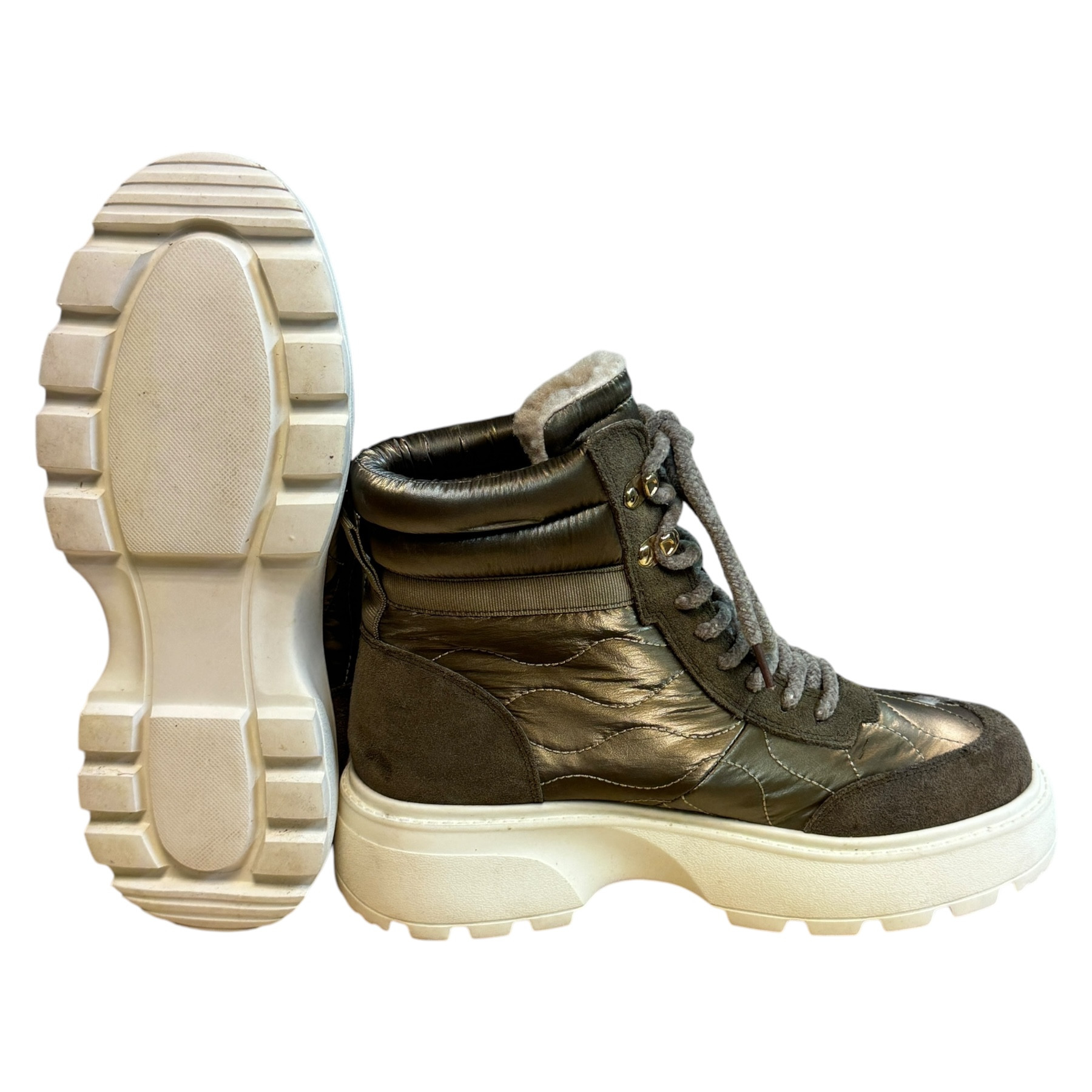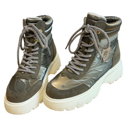 m. zewnętrzny: tkanina, wkładka: tkanina, podeszwa; m. syntetyczny, ocieplane, w. obcasa:5cm, w. cholewki:12cm