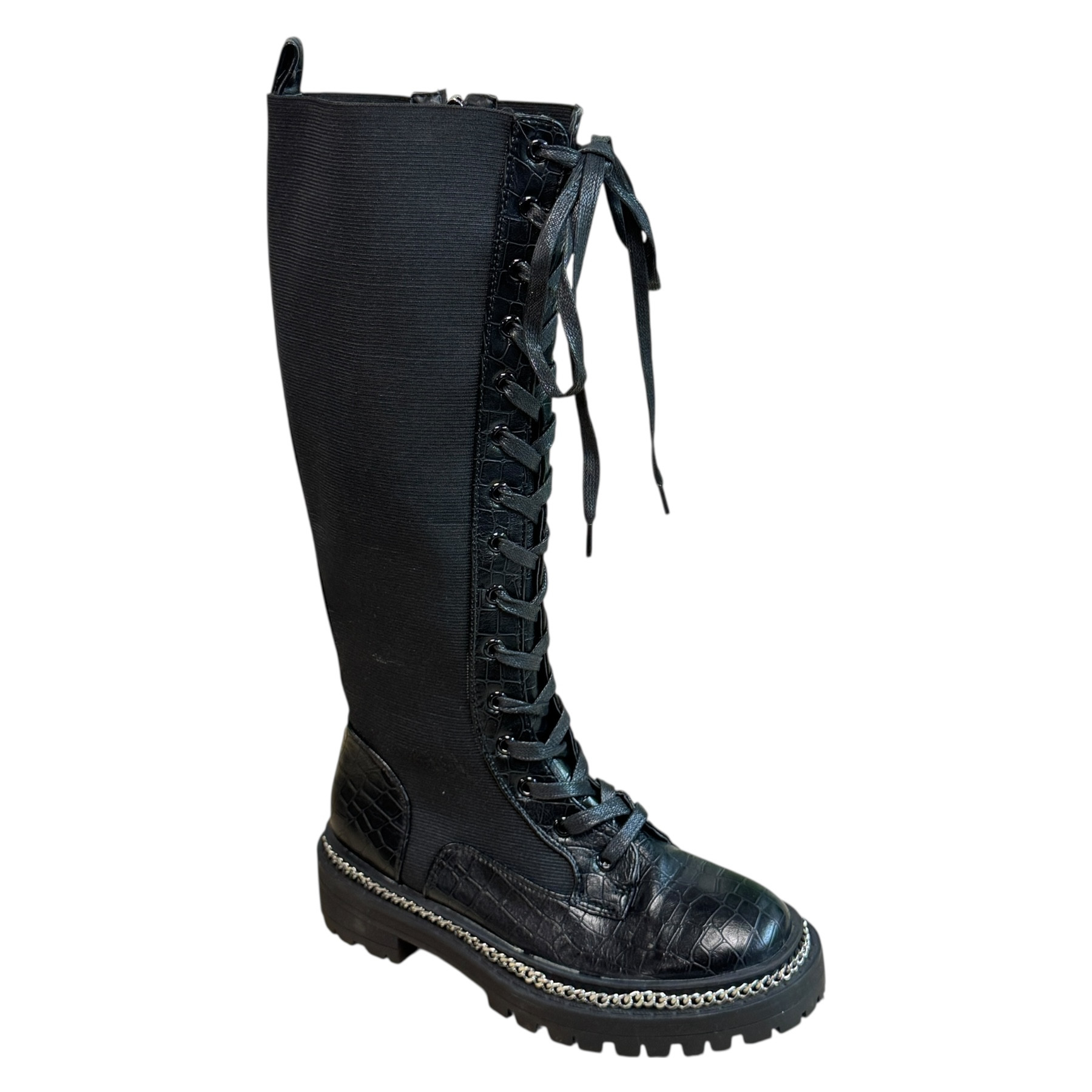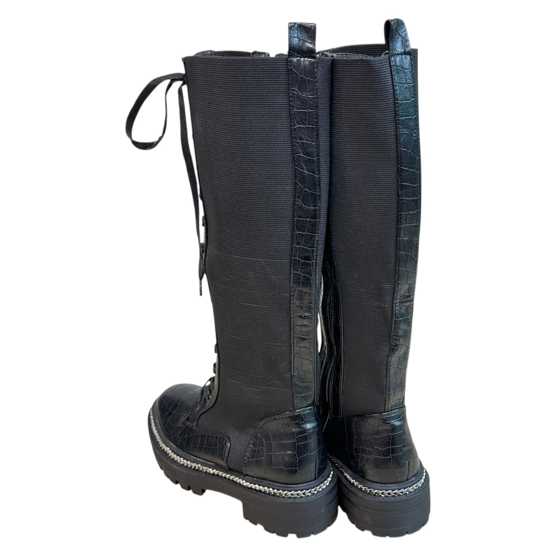 m. zewnętrzny: skóra ekologiczna, wkładka: tkanina,, podeszwa: m. syntetyczny, w. obcasa:3cm, w. cholewki:39cm