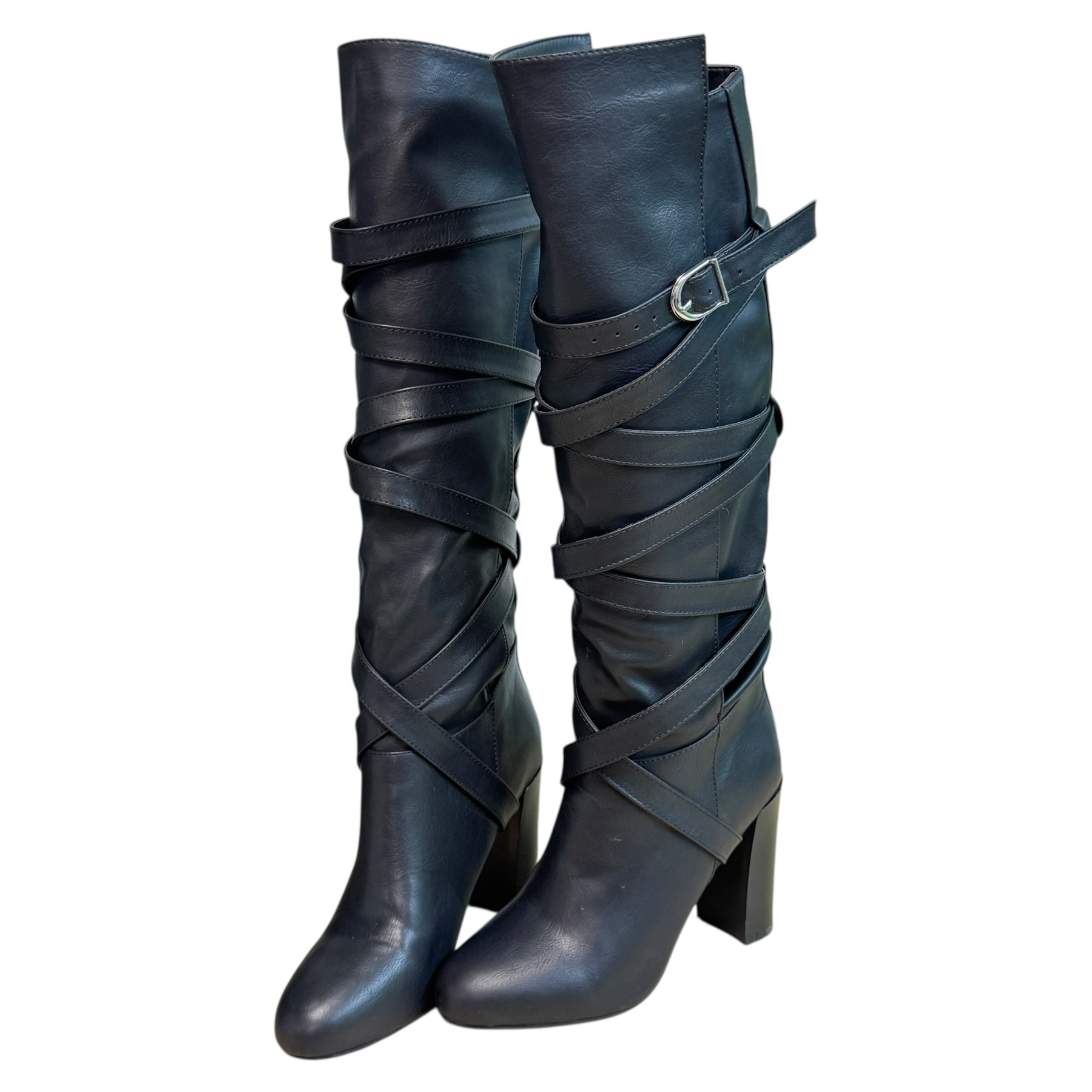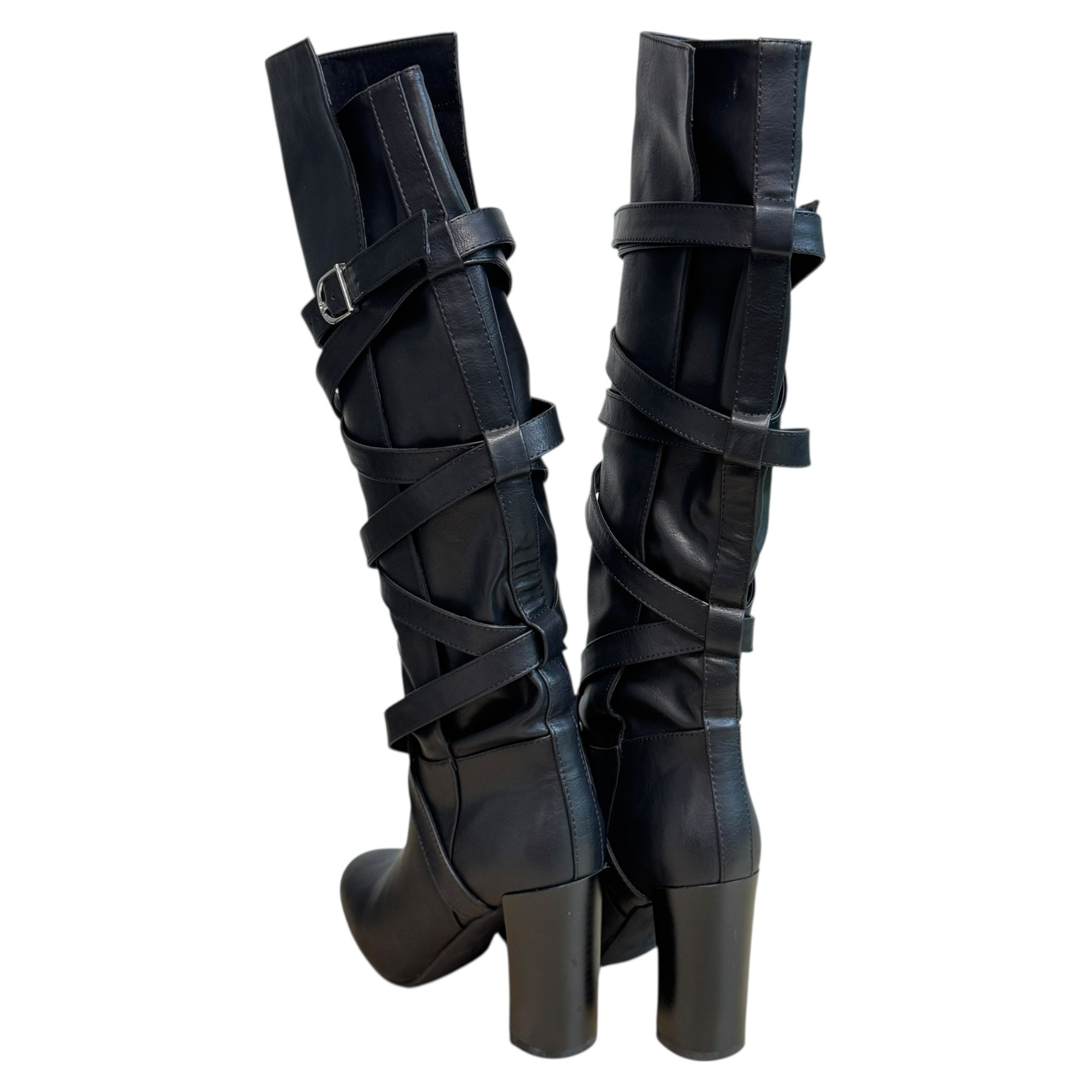 m. zewnętrzny: skóra ekologiczna, wkładka: tkanina, podeszwa: m. syntetyczny, w. obcasa:9.5cm, w. cholewki:42cm